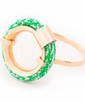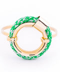 Der Ring aus grünen Seilen am Metallrunder werden mit dem Bronz-Armband zusammengeführt. Der offene Ring, der den Mittelpunkt des Designs bilden, werden durch die Kombination von Seilen und Bronze zu einem originellen Schmuckstück.