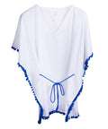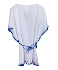 ANEMOSS BEACH DRESS: Anemoss Pom Pom Beach Dress is made from 100% Buldan fabric. It features a white color with blue pom pom details, making it a perfect match for any outfit. It comes in a tie-waist model and is available in L/XL sizes.