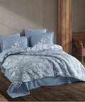 Hira Blue - Double Quilted Duvet Cover Set With the double quilted duvet cover set, you can use it for multiple purposes in four seasons while reflecting the style of your room. The products in the set are made of 100% cotton yarn and soft fabric. The quilted duvet cover set, which uses long fiber fabric in its thread, is durable and long-lasting. The duvet cover and sheets in the set are skin-friendly due to their thread and weaving structure and do not cause sweating. Let the quilted duvet cover set accompany the charming elegance of your room and your pure and innocent sleep with its stylish and elegant pattern. Quilted Duvet Cover Set Package 1 Piece Quilted Duvet Cover 200 x 220 1 Piece Sheet 240 x 260 2 Pieces Pillowcase 50 x 70 Production location: Turkey, Denizli Washing Instructions Wash your products in the machine or by hand with plenty of water on a delicate washing program at 400C. We recommend that you use colormatic detergent when washing. Iron the duvet cover sets with a warm iron. Do not leave the product wet. When washing, wash light and dark colors separately. Never use bleach or bleaching cleaning agents. Wash the products in your machine without squeezing them. It may deform when you compress it while full. Wash and dry the products that have been kept waiting for any reason before drying them. Do not dry your products at high temperatures. Wash and iron all parts of the duvet cover sets before use.