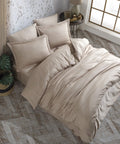 Our Double Satin duvet cover set is made of 100% cotton yarn, cotton satin and ultra-soft fabric. There are 80 strands of thread in 1 cm2. Our satin duvet cover sets are lightweight and soft to the touch. Therefore, it is skin-friendly while giving a silky feeling. Again, our satin duvet cover sets breathe with their air permeability and do not cause sweating. Satin duvet cover has a brighter and flowing structure because it goes through a more frequent weaving process than other types of weaving. Due to the use of long fiber fabric in the yarn of this product, the duvet cover is durable and long-lasting. Our duvet cover set will improve your sleep quality with its smooth and soft texture and bring elegance to your room with its different models. The duvet cover set is sent with its original box and packaging. Package Content: Double Satin Duvet Cover Set, 1 Duvet Cover, 1 Bed Sheet, 4 Pillow Cases. Place of Production: Turkey, Denizli. Washing Instructions: Wash your products in the machine or by hand with plenty of water on a delicate washing program at 40 0C. We recommend that you use colormatic detergent when washing. Iron the duvet cover sets with a warm iron. Do not leave the product wet. When washing, wash light and dark colors separately. Never use bleach or bleaching cleaning agents. Wash the products in your machine without squeezing them. It may deform when you compress it while full. Wash and dry the products that have been kept waiting for any reason before drying them. Do not dry your products at high temperatures. Wash and iron all parts of the duvet cover sets before use.