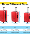Large Suitcase – 28 inch (45 cm * 75 cm * 30 cm): This suitcase holds enough space for almost any trip, especially if you're bringing along lots of baggage. You can fit everything in here, including clothes, toiletry items, books, etc., plus a few suitcases! It has a 45 kg carrying capacity (own weight is 3.70 kg).