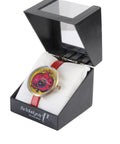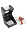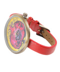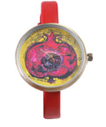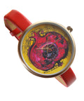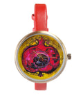 The "Pomegranate" custom design of the artist Canan Berber is applied on the wrist watch The battery is activated when the plastic between the pin and the watch is removed. Japanese battery. 100% Leather strap. Stainless steel back case. Light bronze metal alloy front cover. Japanese movement, 3 ATM water resistant. Diameter: 4 cm, Weight: 30 g, Belt length is 22 cm excluding the buckle.